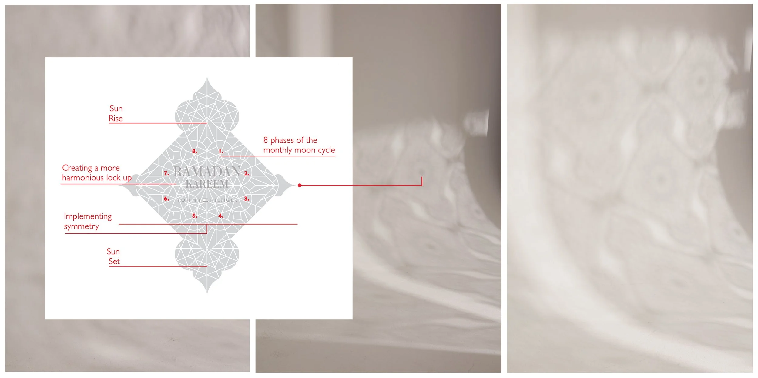 Drawing Inspiration from the prominent use of light at the time of Ramadan. Creating a look and feel that references the transition from day to night. Light represents knowledge, and faith, and is used to mark the start and end of the fasting during each day – the sun rising and the sun setting – The light of the luna phase also dictates the beginning and end of the month of Ramadan.